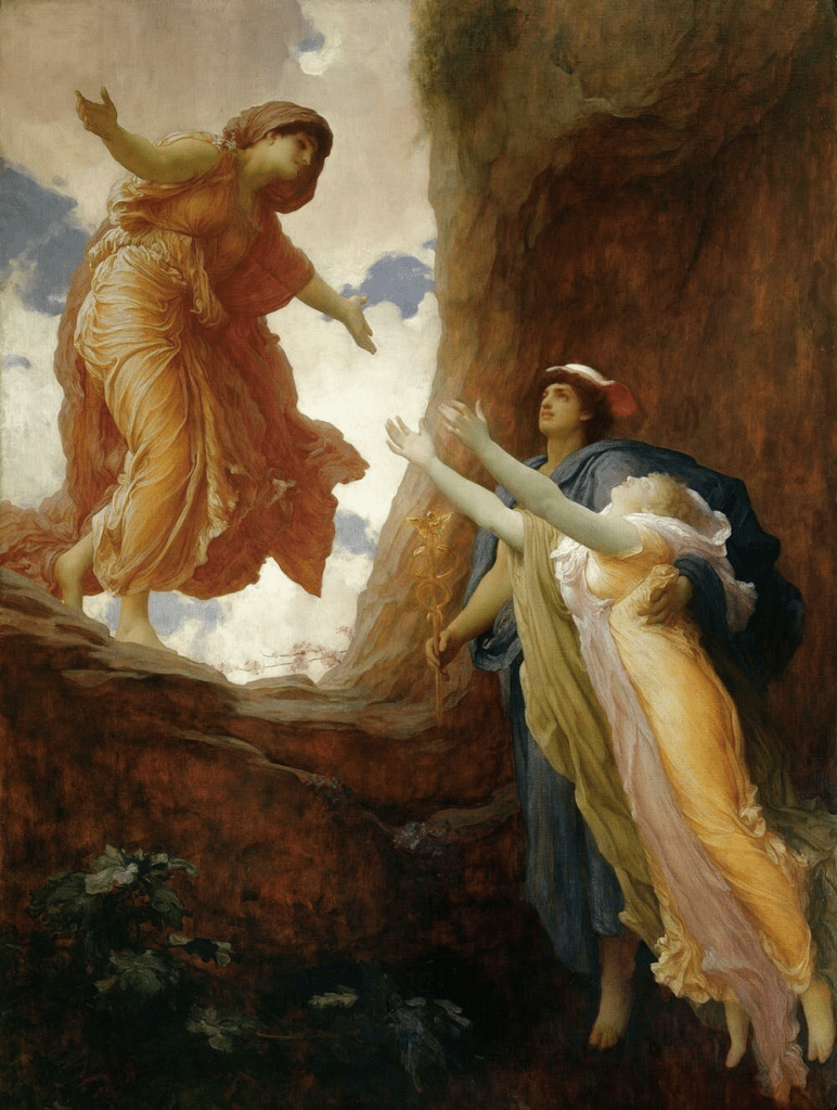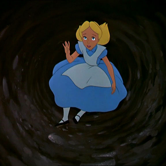 Kore/Persephone returning from the Underworld with Hermes & Alice falling down the rabbit hole to the inner-Earth land of Wonderland